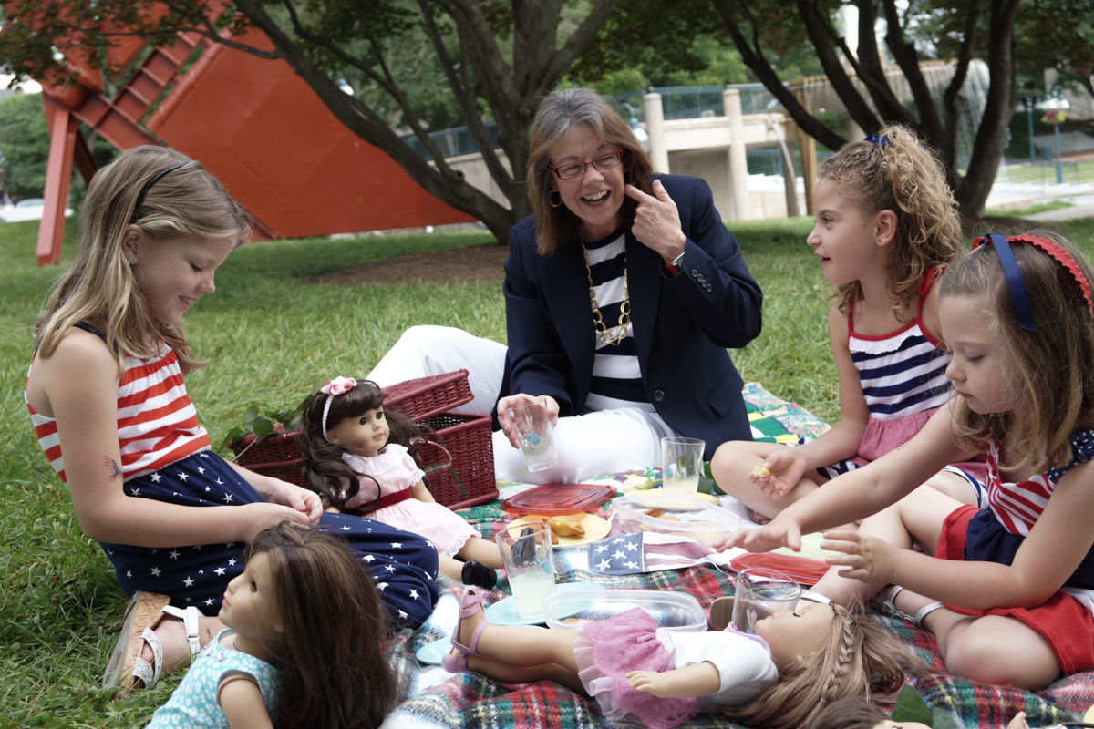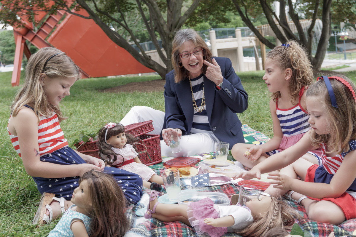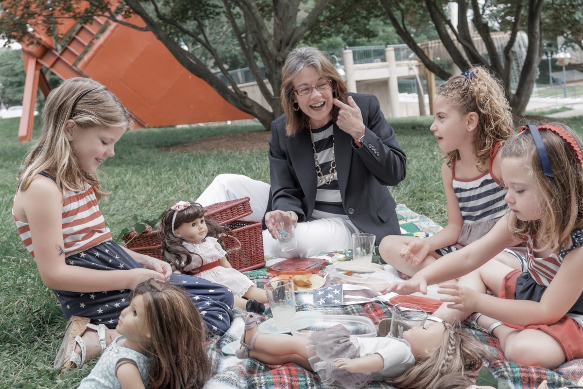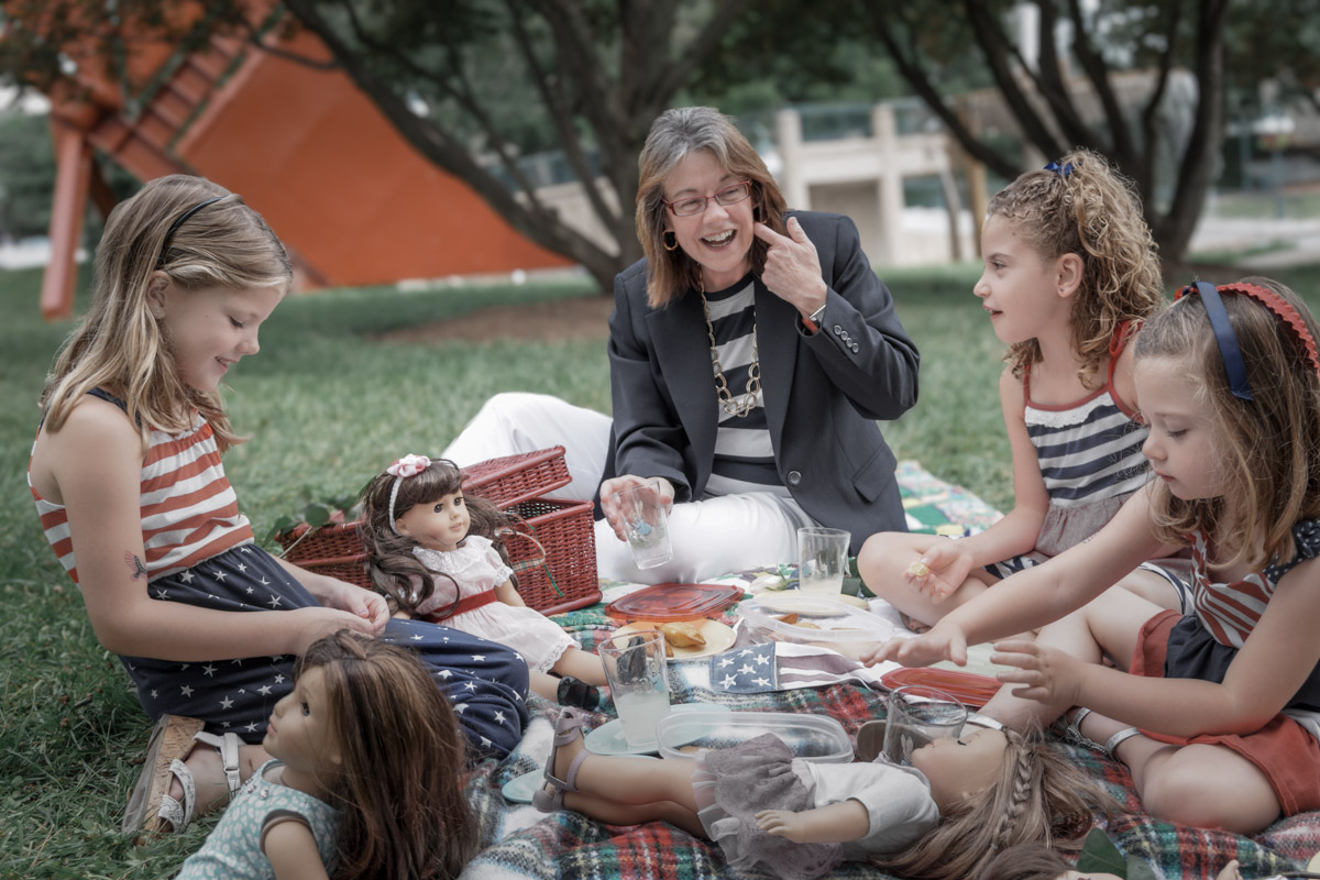 Once the subjects feel right, the background is shaped so it supports the story instead of competing with it. The grass becomes less neon, the orange sculpture steps back visually and the busy structures behind the group lose just enough contrast to stay present without distracting. The entire scene grows quieter, which naturally brings the eye toward the central interaction.